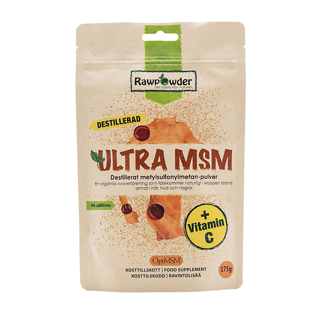 Rawpowders UltraMSM är ett kosttillskott med OptiMSM® och C vitamin för att förbättra effekten. OptiMSM® framställts genom destillation istället för kristallisation och har hela 99,9% renhetsgrad.